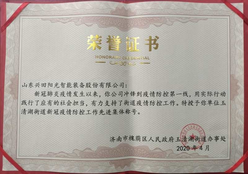 我公司——山東興田陽光智能裝備股份有限公司因在新冠肺炎疫情防控工作中表現突出,被槐蔭區玉清湖街道評為“新冠肺炎疫情防控工作表現突出的先進集體”,并被授予“抗先鋒團隊”榮譽稱號。