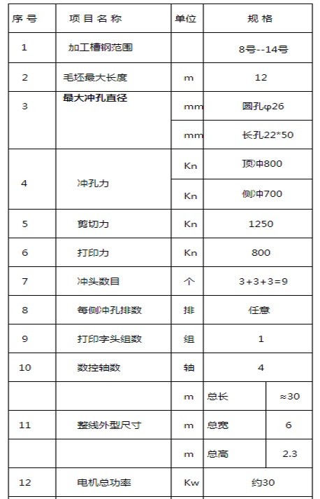 槽鋼三面沖主要用于送變電與通訊行業(yè)金具生產(chǎn)以及建筑行業(yè)的槽鋼構(gòu)件的打印、沖孔和切斷工藝。槽鋼三面沖具有獨立的液壓動力機構(gòu)和電氣數(shù)控系統(tǒng),采用中央集中控制。同時為了方便主機的模具調(diào)整和其它部件調(diào)整,也具有部分分散控制動作。下面重點介紹一下槽鋼三面沖主要技術(shù)規(guī)格。